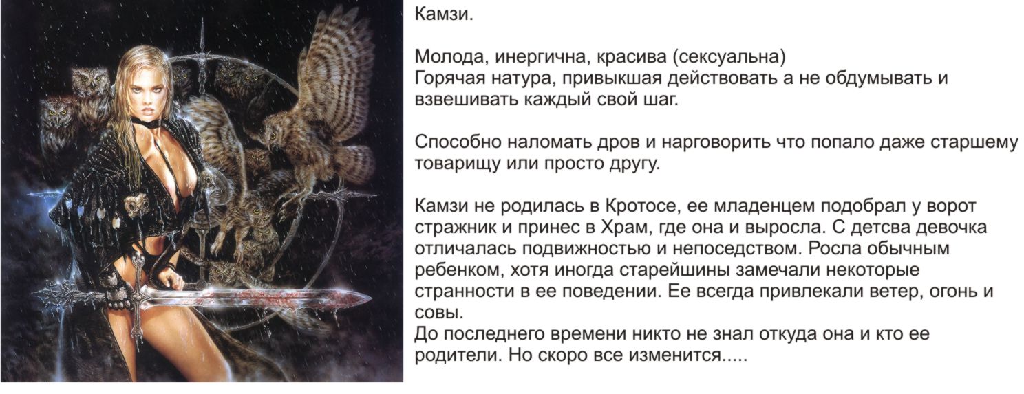 | Год ХХ01, вечер, багряный закат простёрся над Лааром. Хорошенькая (мы все вэто верим) Kamzy, одиноко, опустив залитое кровью лицо, бредет еле переставляя ноги, оставляя кровавую полосу от меча, волочащемуся по земле. в нескольких кварталах от нее лежит окровавленное тело, как она считает, убитого ею кровного врага. Вражда их начилась очень давно.... За следующим поворотом она встречает, sergus2008, который с недоумением уставился на Kamzy, никто еще не видел ее в таком состоянии..... дойдя до него Kamzy, свалилась в обморок, однако меча и зажатой в другой руке цепочке с кулоном, не выронила... Хорошо sergus2008, успел ее подхватить, иначе она бы ударилась головой о булыжник, и сериал закончился бы так и не начавшись.... Не смотря на все попытки, sergus2008 не смог привести Kamzy в чувство, и отнес ее в ближайший храм Кротос-city, где остаив ее на попечение смотрителя, принялси за поиски и устранение следов преступления sergus2008. Он долго искал место поединка, уже наступила глубокая ночь, когда он наконец обнаружил переулок в котором бились Kamzy и ....... , и ( блин не придумал пока), и был очень удивлен отсутсвием тела и всего двум доржкам следов ведущих от туда... место поединка являло собой страшное зрелище, создавалось ощущение что там бились не люди а 2 стихии.... стены ближайших домов были в дырах, видимо по ним били огромным молотом, деревь трава и вся остальная растительность выжжена... даже на небо было абсолютно черным, без звезд, хотя ночи в это время были ясные.... ____ Чьими были одни Следы он знал, а вот вторые были гораздо больше следов Камзи и вели в направление соседнего враждующего клана Пойдя по следам он заметил, что оставивший их был очень сильно ранен, и через каждые 10-15 метров присаживался отдохнуть. Дойдя до ворот кланы, у которых стояли два охранника, он развернулся и отправился обратно, во всяком случаае он знал что Камзи билась с кем-то из клана МотD Вернувшись в храм он застал Камзи в полном сознании переодевшуюся и отмывшуюся от грязи и крови... но лишенную дара речи...